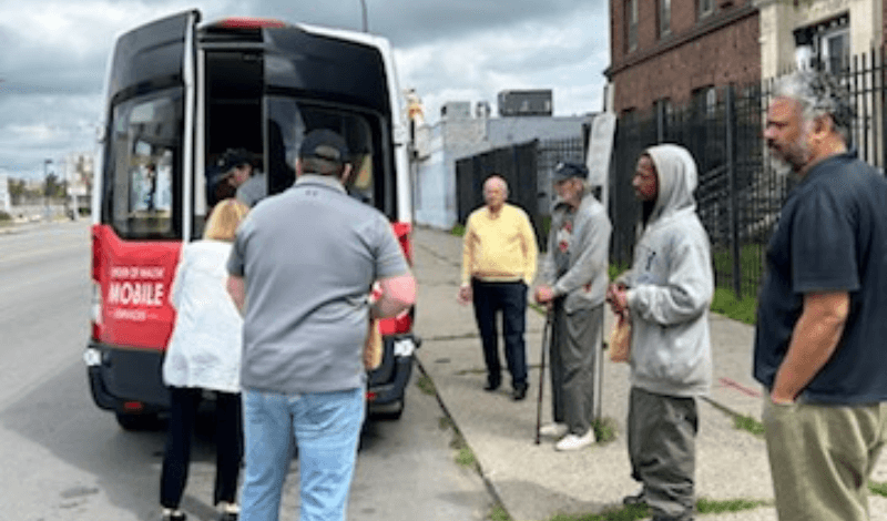 Also at the First Saturday event, Sean Shriner, Member in Formation, collected 140 sandwiches and other supplies provided by Michigan Area members and parishioners at St. Edith’s in Livonia, as part of the Michigan Area’s “Into the Fire” ministry to Detroit’s homeless. That afternoon, Sean and his wife, Jenna; Thomas Larabell, KM; Barbara Wilson, DM; and Robert Wilson, DM, distributed 120 sack lunches to people living on the streets of Detroit. The remaining 20 lunches were donated to Detroit Rescue Mission.