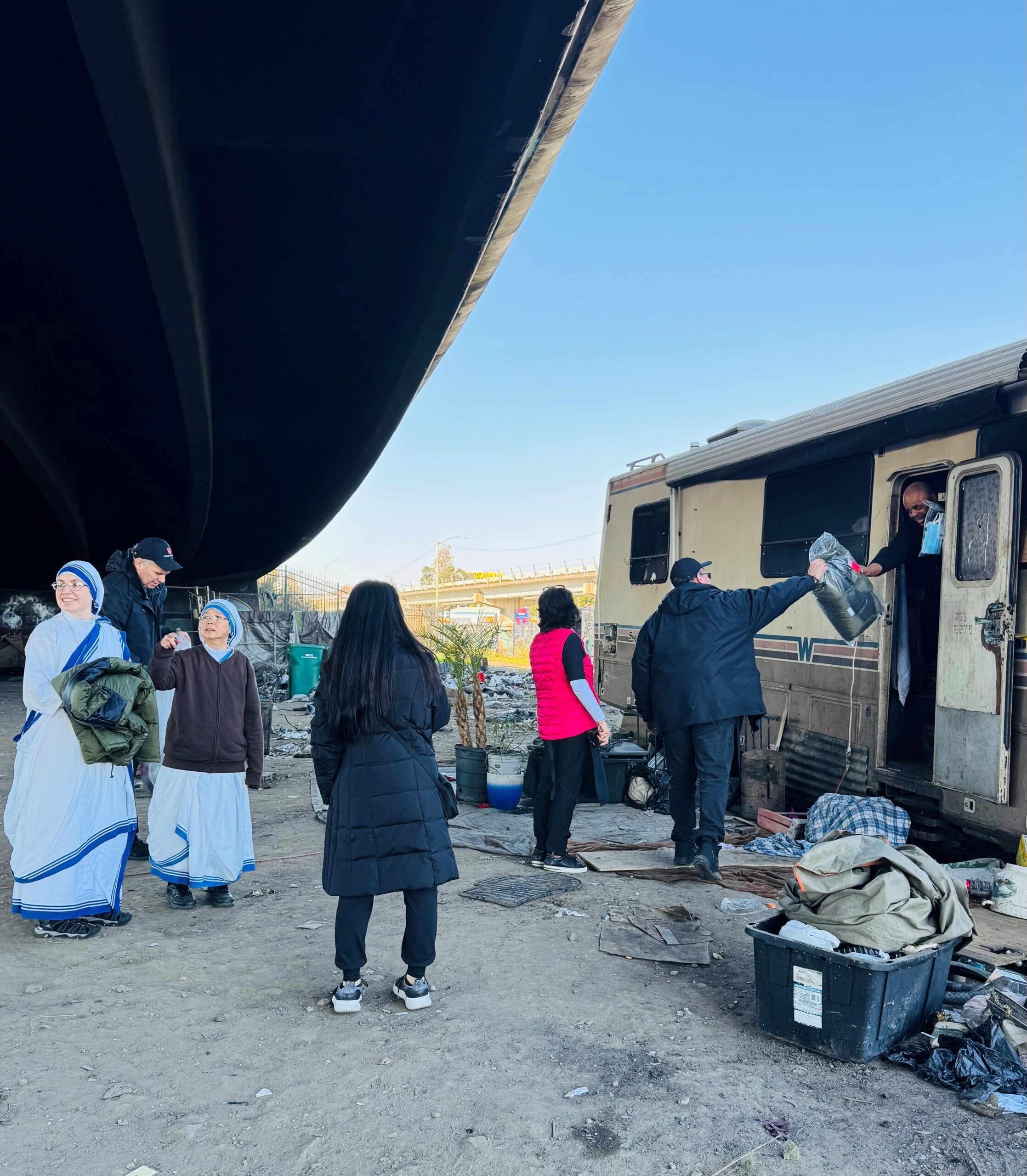 We distributed lunch, hygiene kits, and a special Christmas gift of 75 new, warm coats. These much-needed coats were generously provided by the Hospitallers of the Western Association—thank you, Mike’s. They were received with great joy and appreciation, especially timely given the recent cold weather.